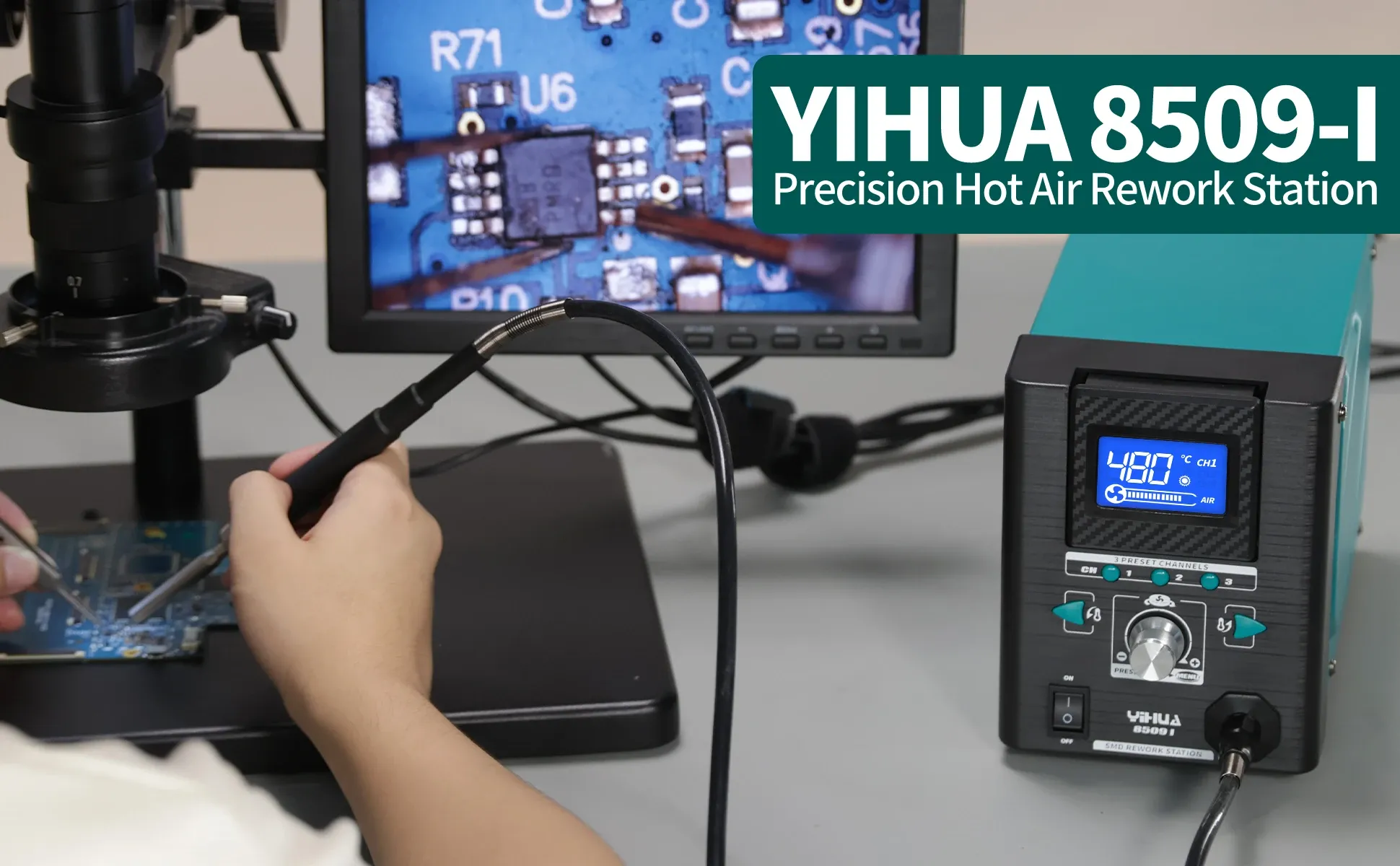 The YIHUA 8509-I Micro Hot Air Rework Station. Engineered with a pen-style handle for delicate SMD components and advanced electronics repair.